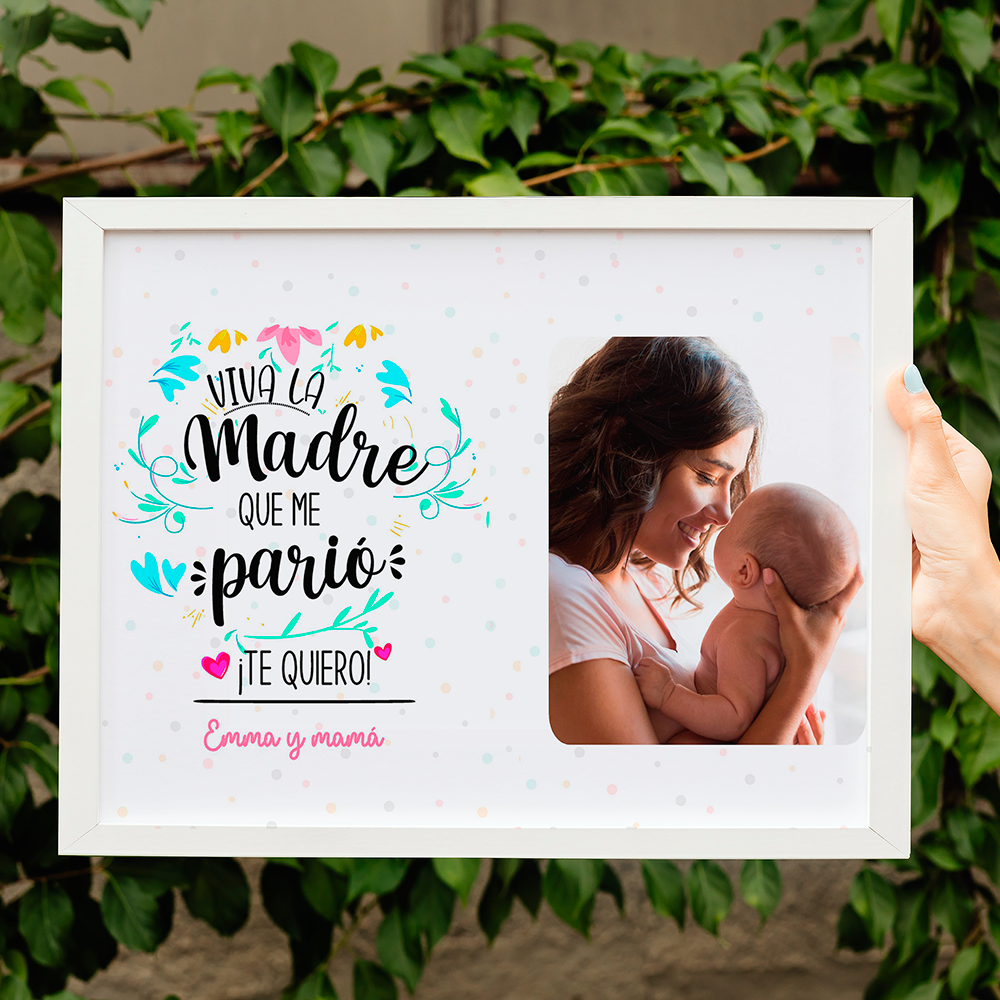 Lámina personalizada con la dedicatoria «Viva la madre que me parió» . Está disponible en dos tamaños: Mediano (210x297mm) o grande (420 x 297mm). El marco está incluido en el precio.